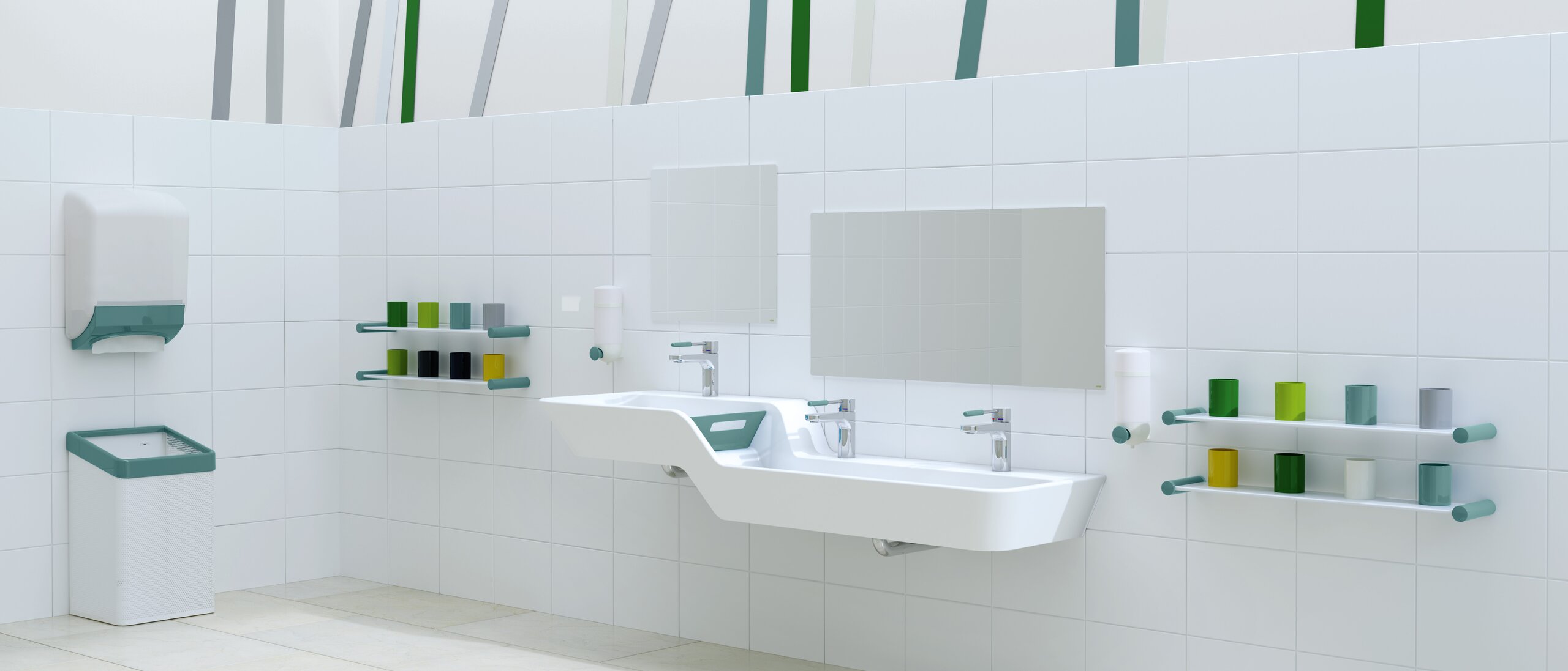 Kindgerechte Sanitärräume unterstützen bei der selbstständigen Handhygiene. Händewaschen und Zähneputzen machen doch gleich viel mehr Spaß, wenn die Waschplatzgestaltung an die Bedürfnisse der kleinen Nutzer angepasst ist. HEWI bietet ein Komplett-Sortiment rund um den Waschplatz, das mit fröhlichen Farben geradezu zum Waschen und Plantschen einlädt. Das Sortiment umfasst Waschtische, Spiegel, Armaturen, Zahnputzbecherleisten und Accessoires wie Seifenspender oder WC-Papierrollen-Halter. Eine hygienische Alternative zu Handtüchern stellen einzeln entnehmbare Papierhandtücher dar. Ausgewählte Produkte wie der Waschtisch sind nun neben neutralem Weiß oder fröhlichem Apfelgrün auch in frischem Aquablau verfügbar.
