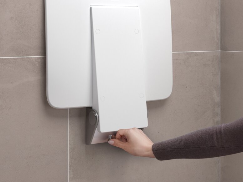 Mobile HEWI Lösungen zur Befestigung von Sanitärprodukten bieten die Möglichkeit, Sanitärräume flexibel an die individuellen Bedürfnisse der Nutzer*innen anzupassen. HEWI bietet in diesem Sinne mobile Stützklappgriffe und Duschsitze an, die sehr anwenderfreundlich und gleichzeitig ebenso funktional sind, wie die fest installierten Sanitär-Lösungen.  Für die Anbringung der Montageplatte, in die bei Bedarf die mobilen HEWI Lösungen eingerastet werden, wird eine große Auswahl an Dübeln und Befestigungsmaterialien zur Verfügung gestellt. Dadurch ist es möglich, die Produkte an den unterschiedlichsten Wänden anzubringen. Werden die unterstützenden Lösungen von HEWI nicht benötigt, verdeckt eine Abdeckplatte die Montageplatte, bis die Produkte angebracht werden. Bei der Anbringung und Abnahme dieser ist kein Werkzeug notwendig, da die mobilen Lösungen einfach in die installierte Montageplatte eingerastet und im Anschluss mit einer Befestigungsschraube gesichert werden.