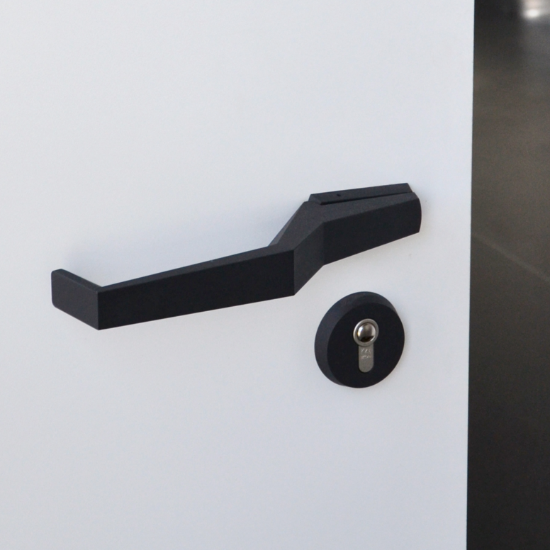 In contrast to this is the administration and seminar complex, which is transparently designed with a glass façade and offers, for example, a maximum of flexible use and networking through decentralised technology. The contrast between open and closed is reflected in the chosen black and white contrasts. In the laboratory area the walls are black and the floors are made of white epoxy resin. In the seminar area, on the other hand, the walls are white and the floors are covered with black carpet. The dynamic shape of the administration building is reflected in the flowing form of the door handles. Here series 120 in black was used.