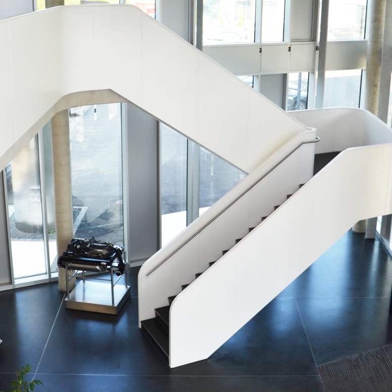 The development of new engines is becoming increasingly complex and requires multidisciplinary development teams. For this reason, 16 institutes of the Technical University (RWTH) have joined forces in the CMP (Center of Mobile Propulsion) in Forckenbeckstraße in Aachen. Interdisciplinary research is carried out here, for example, on reducing CO2 emissions from passenger cars and commercial vehicles. The new research centre was designed by the architects Lepel & Lepel Architektur. The CMP is designed in such a way that the office space and laboratories can be used flexibly. It consists of two building sections: One wing contains a laboratory, which includes engine test benches, workshops and changing rooms as well as showers for the mechanics. The other part of the building is an administrative and seminar complex. The engine test benches in the laboratory building pose a particular challenge - as they are subject to particularly high safety requirements. Among other things, particularly high fire protection requirements must be met here. For example, prototypes are tested on the engine test benches, which are subject to secrecy. This part of the building is therefore designed as a self-contained block.