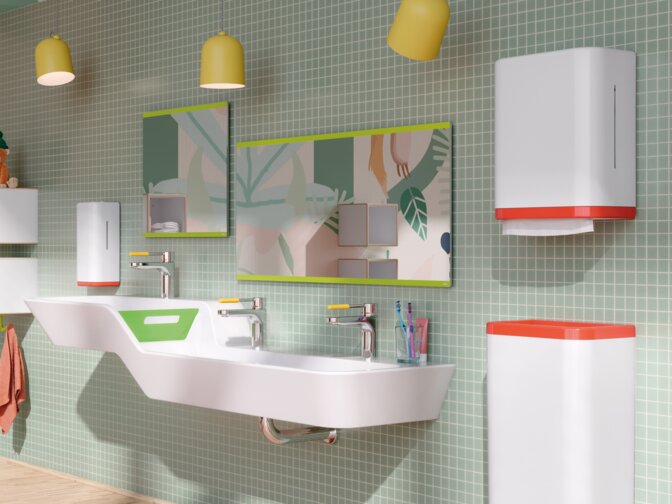 HEWI offers customised solutions for kindergartens and schools that combine design, functionality and durability. From the door to the sanitary areas, robust concepts are created that can withstand heavy use. HEWI can be used to build barrier-free sanitary facilities for schools and daycare centres that meet the respective requirements.