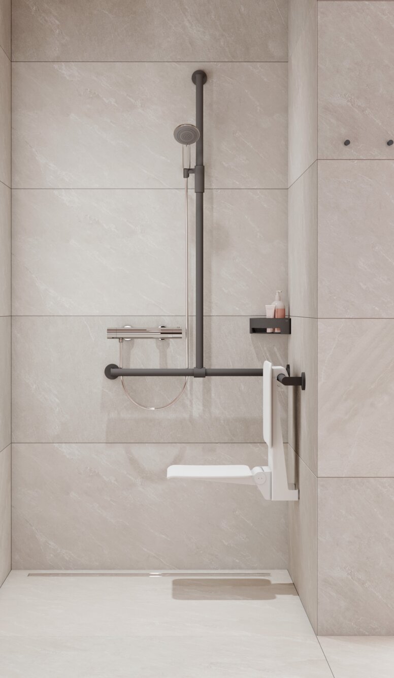 Our mobile solutions from the System 900 range adapt to a wide range of requirements. In addition to shower seats and hinged support rails, we also offer a wide range of additional adaptations. One major advantage is that mounts for hinged support rails or shower seats can already be taken into account during the planning phase of the bathroom renovation without having to be installed immediately. This means that the sanitary products are available right when the users need them.