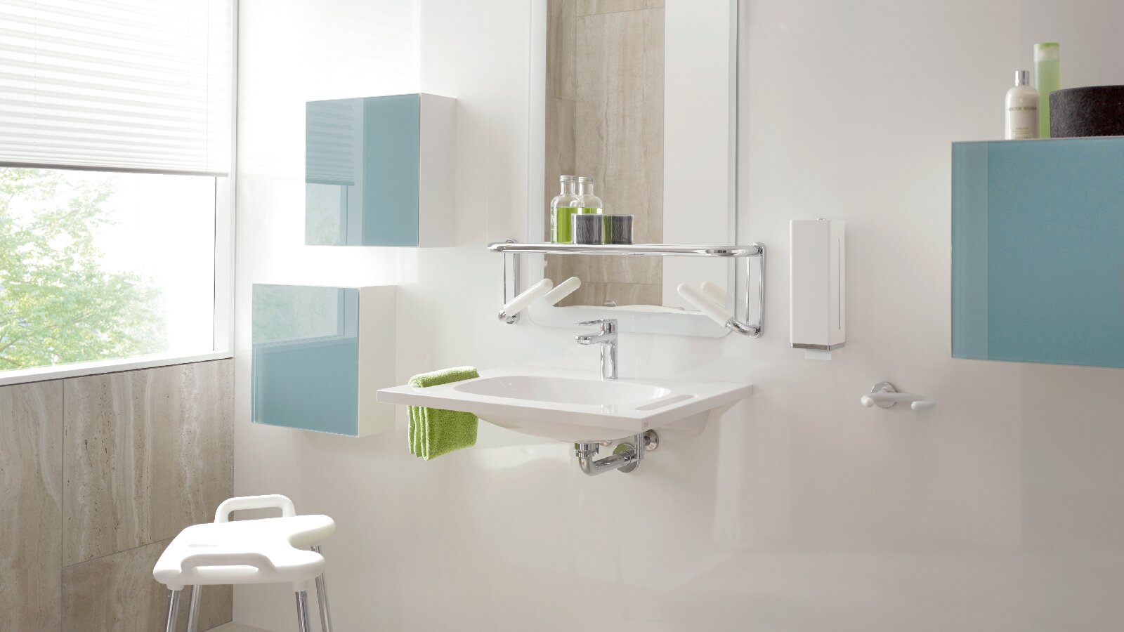 This system was also developed with an eye to the adjustable height of individual modules. This applies particularly to important areas in nursing care, such as hinged support rails on the toilet or height-adjustable shower seats. Elements and touch surfaces can be ordered in different colour variants and support visual, haptic as well as aesthetic requirements.