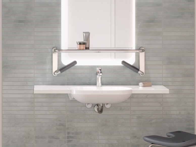 The well-thought-out product details of LifeSystem offer both comfortable and safe use. Together, the products create an intelligent system that supports the user and also the care personnel. LifeSystem can be combined with HEWI's WARM TOUCH bar system. This allows the hanging seats to be easily attached to the handrails and grab rails. WARM TOUCH combines the visual properties of high-gloss chrome surfaces with the haptic properties of polyamide. The products feel pleasantly warm and thus contribute to a sense of well-being. These properties make HEWI WARM TOUCH particularly suitable for patients with increased sensitivity to cold, as is the case with rheumatic diseases, for example.